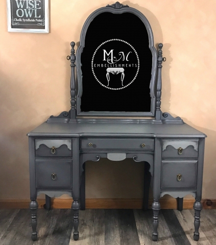 This beauty of a vanity was painted in Wise Owl Peppercorn. The detailed areas were painted in a wash of Wise Owl Smokey Quartz and Wise Owl Gray LInen. The piece was sealed with General Finishes High Performance Topcoat and then Waxed and stained to create the aged effect. It was finished off with Wise Owl Lemon Verbena Furniture Salve.