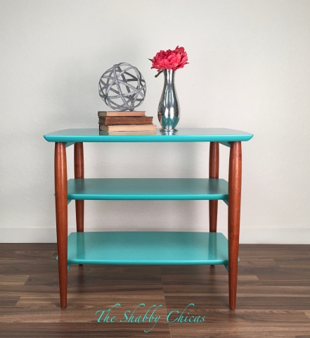 Too cool MCM 3-tier table painted with our favorite go to color-General Finishes Patina Green Milk Paint. Legs were freshed up with furniture oil. Painted surfaces were sealed with High Performance Top Coat Satin Sheen.