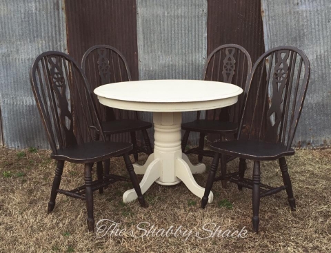 Oak dining table painted in General Finishes Linen Milk Paint. Chairs were painted in General Finishes Lamp Black Milk Paint. Sealed with General Finishes Flat out Flat Topcoat.