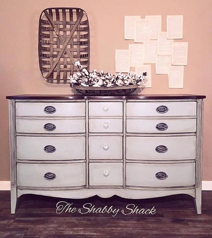 Antique dresser painted in General Finishes Chalk Type Paint in the color Summertime Blue. This is the most unique color I have ever used. In some light it comes off white and some light you can see the faintest of blue. This is perfect for a farmhouse or shabby chic style. The top has been stained with General Finishes Java Gel and sealed with GF Gel Topcoat.