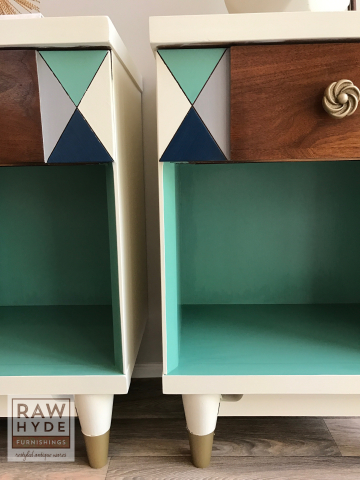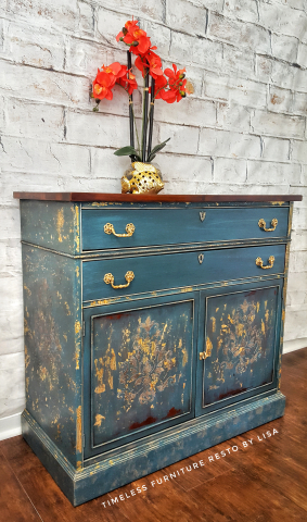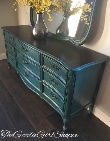 The dresser was painted using a custom blend of 1 part Patina Green, 2 parts Emerald, 2 parts Coastal Blue and 1 part Corinth Blue Milk Paints which created a wonderful peacock blue.