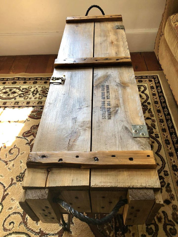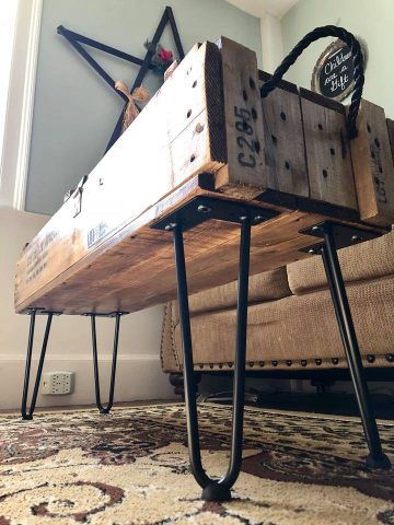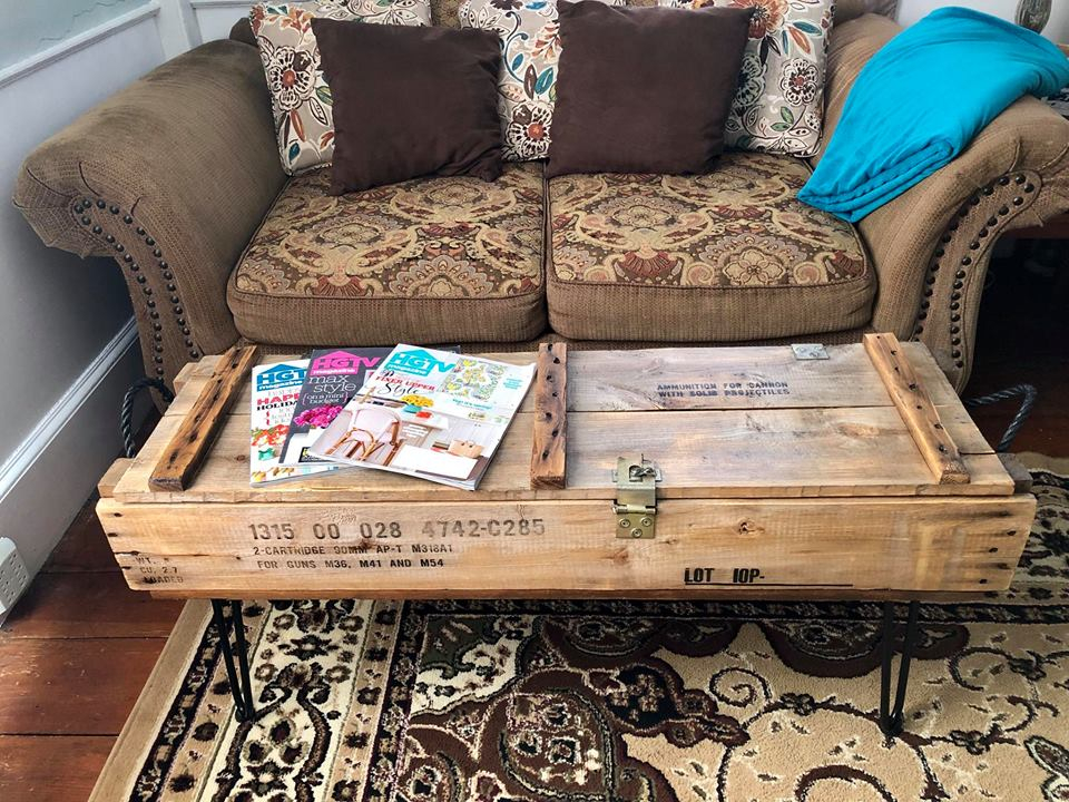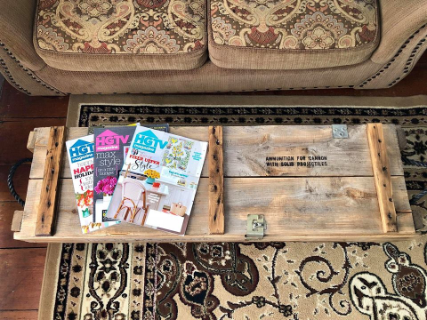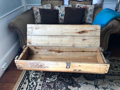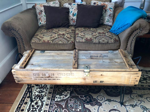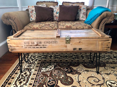 This repurposing project was a BANG! I took an old wooden ammunition box and repurposed it into a coffee table. The box sits on four black hair pin legs and has a satin finish. There are some really cool markings on the outside of this box. This piece of furniture would be perfect for a gun enthusiast, a military family or a father who's teenage daughter is dating. This coffee table is rustic, super unique and has storage. Â
