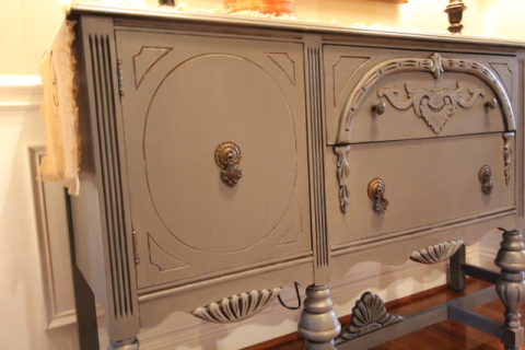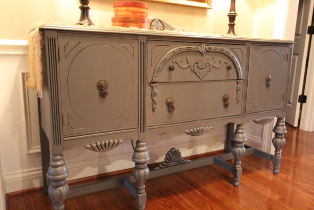 This anitque hall table was originally a dark veneer that had water damage. Due to the veneer being so thin, it wasn't easily repairable so it was the perfect candidate for a upcycle project. I used General Finishes 75% persian blue with 25% seagull gray milk paint. I then used General Finishes high performance clear as a sealer. Next I used General Finishes Van Dyke Brown Glaze and then lightly it away wiped away with a cloth so it stays in the recesses. Then I followed with a coat of General Finishes high performance top coat.