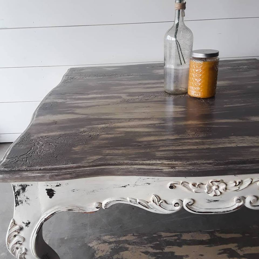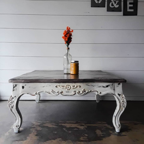This coffee table was a solid brown finish when I found it. The top had this beautiful texture to it randomly and I thought it would look so perfect with a shabby chic or farmhouse finish. I decided to play around on the top mixing different shades of grey and white and blending them for a barnwood inspired finish. I adore how this one turned out, how it blended and how well it distressed! And the texture enhanced the barnwood inspired look perfectly!