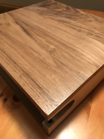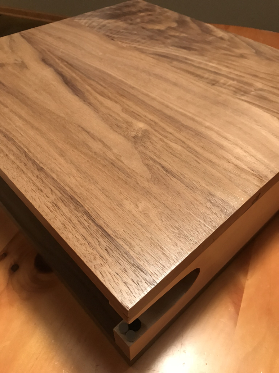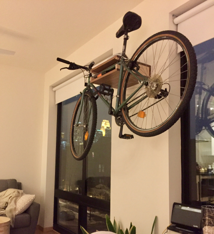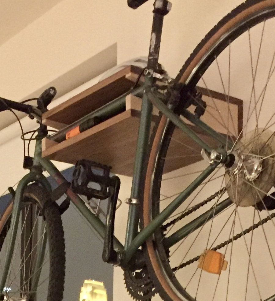 This bike hanger was designed to save space in my daughters’s apartment. Black walnut and maple were used for a stunning look. Seven coats of General Finishes Satin High Performance Topcoat was applied to bring out the natural grains. I sanded the shelf between each coat.