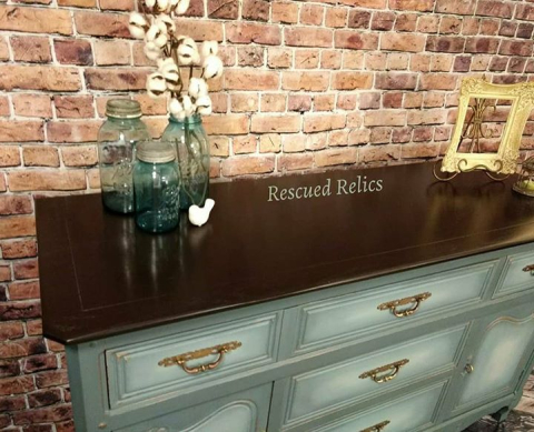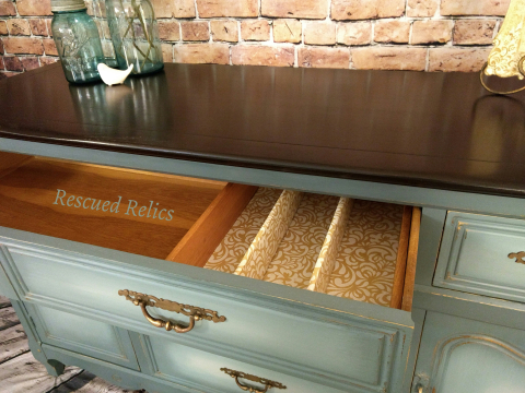 Buffet refinished applying a special blended technique using Dixie Belle paint in shades of Stormy Seas, Vintage Duck Egg and Driftwood. Lightly distressed and very subtle bits of gold guilding added to highlight. The top was done in General Finishes Java Gel and sealed with 3 coats of Gel Poly. An applique was also added to the bottom trim to hide an ugly inlade floral design. This was my first blending project and I was really happy with how it turned out! Â