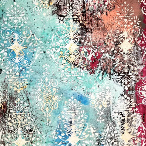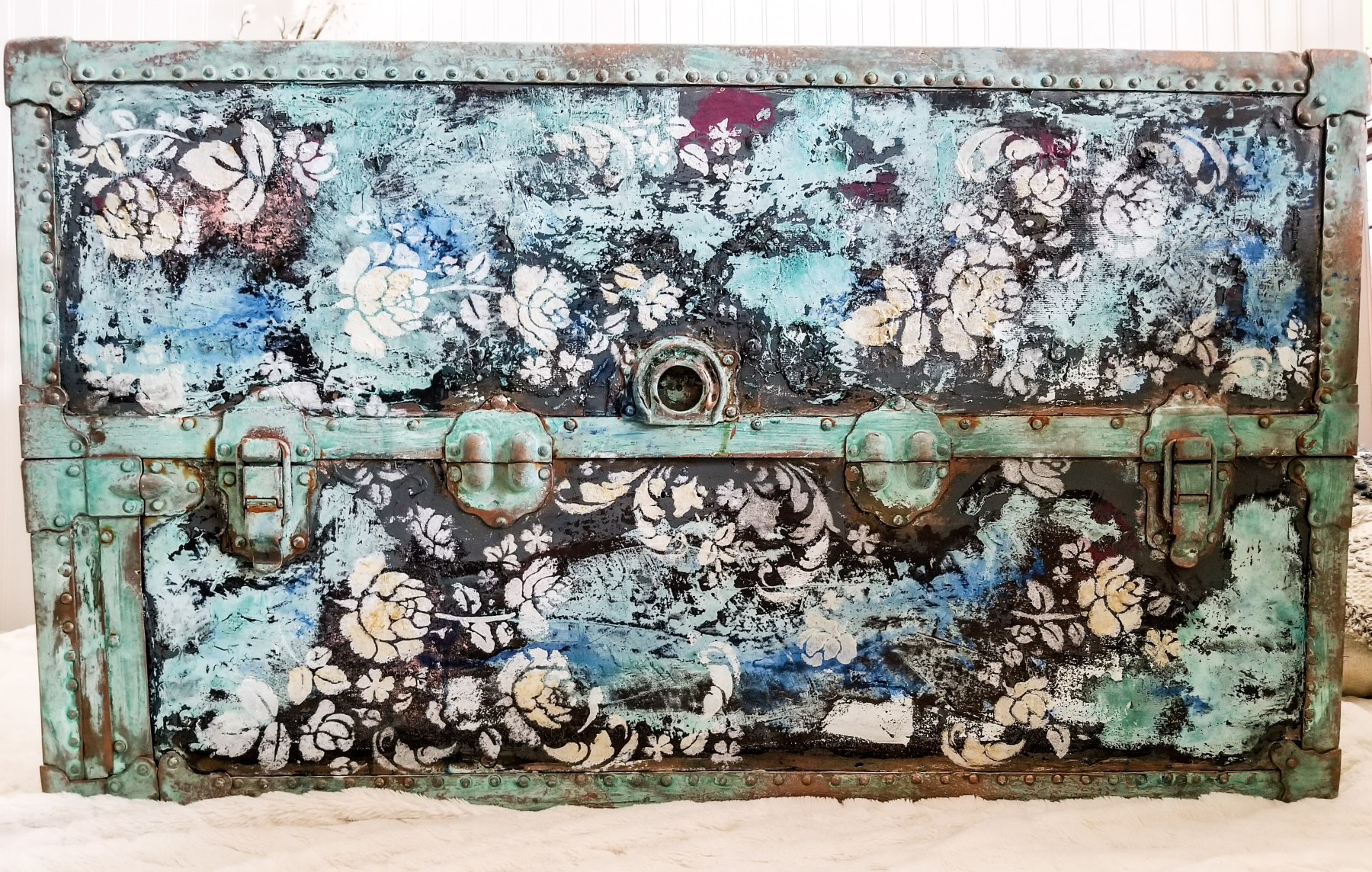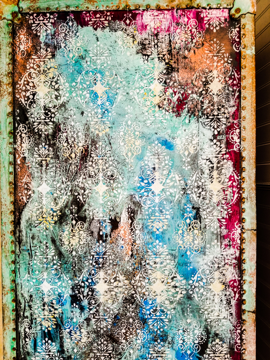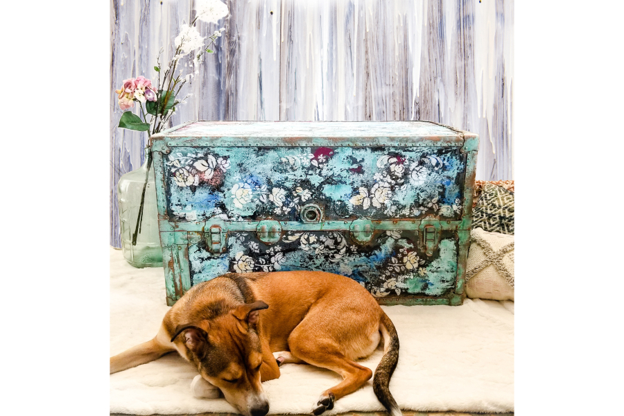 This battered steam trunk instantly inspired me. It was begging for texture. I used a base coat of dixie belle's stormy seas with valspar crackling agent. I then used a putty knife to smear on plum crazy and cotton. I used my chip brush to dab on Aegean coral. I smeared on bronze patina paint and painted the metal hardware with copper paint. I sprayed blue, green, and electric blue activators. After it had set for 24 hrs, I then stenciled on [re]design with prima s upcoming stencil in French Damask and Madelia Garden with their new crackling texture paste in white and gold. Sealed with spray on varathane. Easy peasy ;-) My dogs insisted on being models.