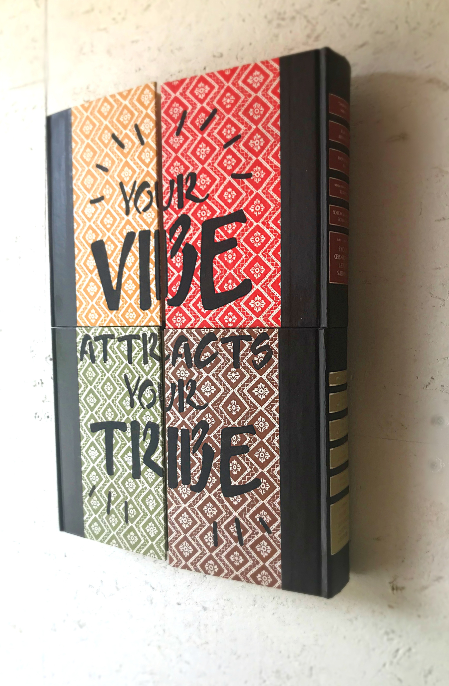 These vintage books have such great color and patterens, not to mention the leather binding, they deserve to be fully displayed- not just pushed into a shelf. Let's think outside the wood and metal signs!
