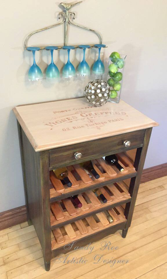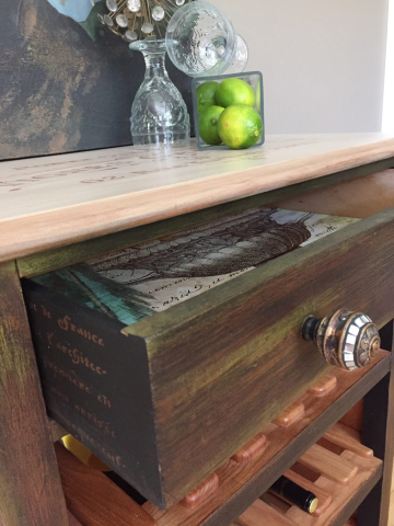 Once a dresser well used to the point the drawers were broken or missing. Â The finish was blah and worn out from years of use. Â I worked with my trusty craftsman (who built the wine rack insert) and repurposed this into a beautiful and functional bar as well as statement piece. Â The stencil is NOT a transfer but a custom cut image that I stencilled with Amber Shellac. Â