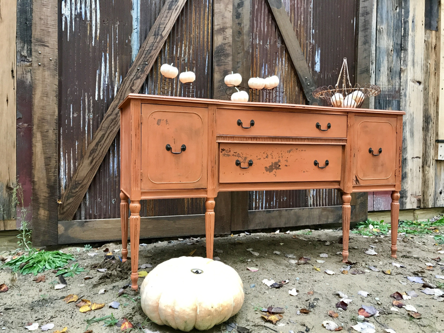 With this buffet I painted it with MMS Milkpaint in Outback Petticoat and it naturally chipped. Â I used a softbrush to remove any paint chips and sealed it General Finishes clear water based topcoat. Â Love the color.Â