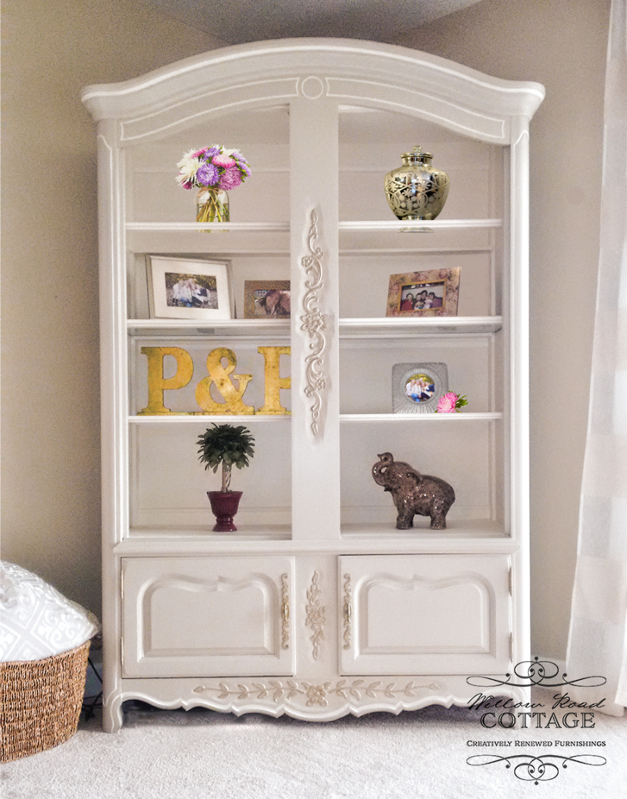 The french countryside came calling when this piece was transformed from a china hutch to a french-infused multi-purpose etagere. Using a 50/50 mix of GF Chalk White and GF Chapin Gray on the body, with the detailing done in GF Chalk White and Modern Masters metallic paint bringing life and vibrance to the carved florals, the colors in this piece are reminiscent of traditional country french furniture of old. This piece is now enjoying new life!