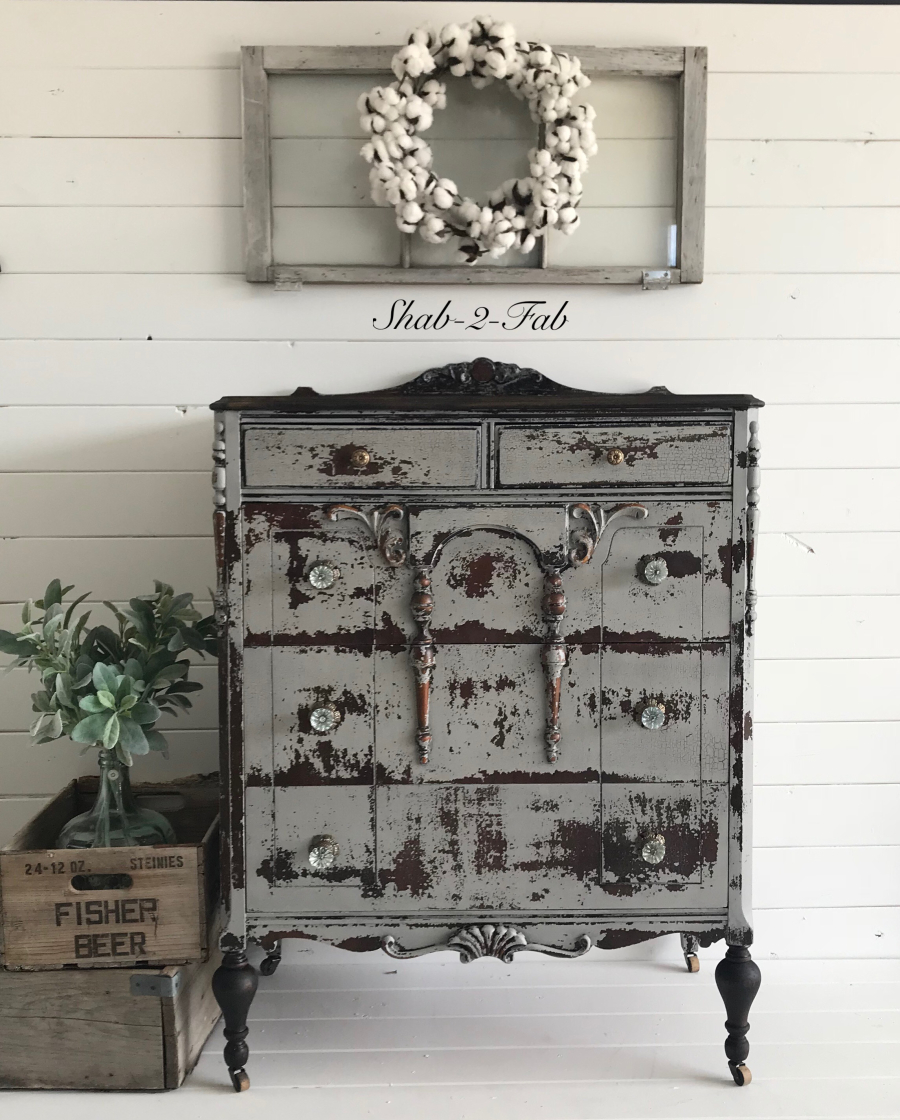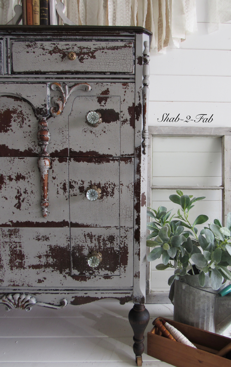 This gorgeous antique dresser was given a chippy finish using Sweet Pickins Milk Paint in the color Haberdash and sealed with their amazing dark oil wax. Beautiful glass knobs were added to complete the look.Â
