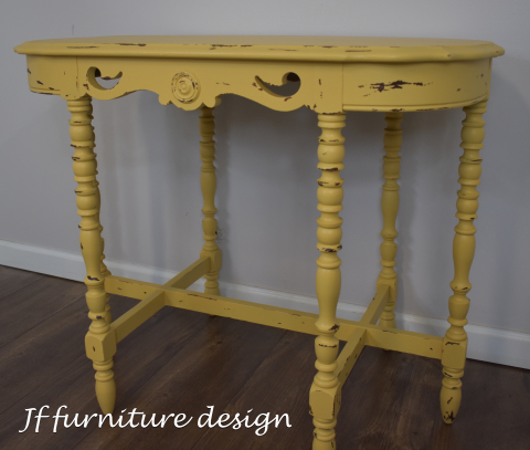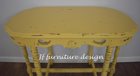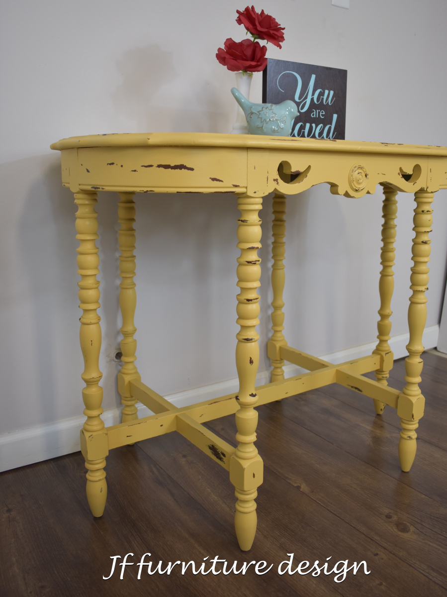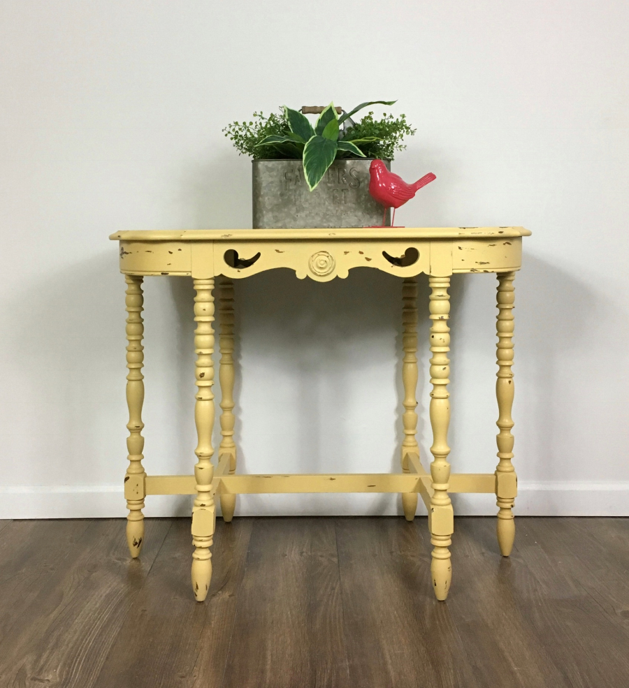 This chippy farmhouse style table adds a little bit of sunshine to the room! The antique maple accent table had beautiful details but needed updating. I knew that General Finishes milk paint in Somerset Gold was just what she needed. Using a resist prior to painting, the milk paint bubbled up just as planned in those areas. Once that was removed, I cleaned the resist off of the table and applied High Performance Top Coat by General Finishes in flat.