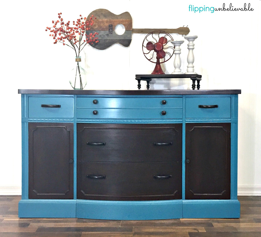Loving the pop of color that this piece offers! The client brought a piece of art that they already owned and wanted it color matched on this buffet. I mixed General Finishes Coastal Blue and Patina Green milk paints and fresh Antique Walnut stain brought out the beautiful features as well.
