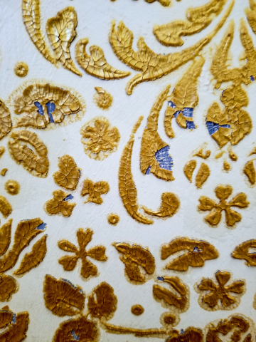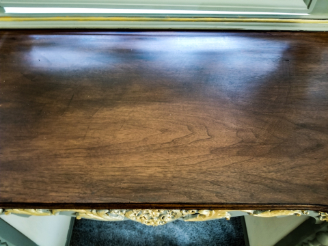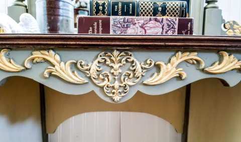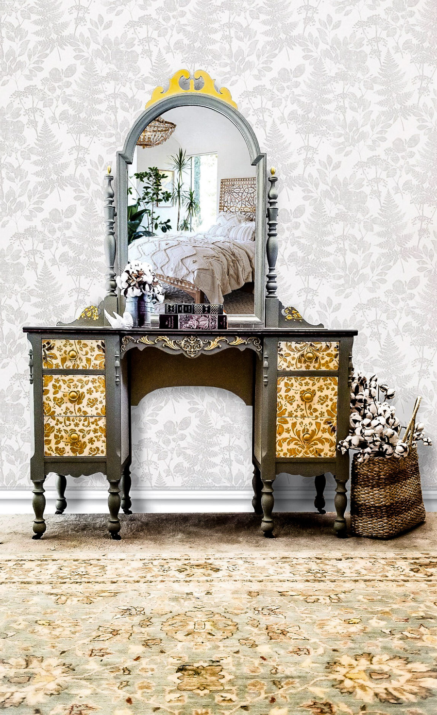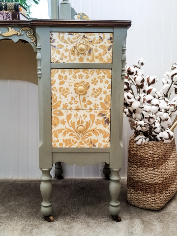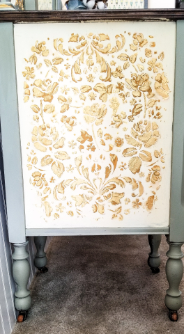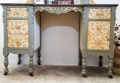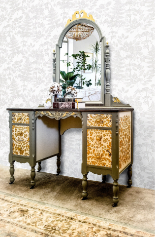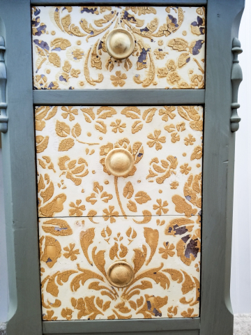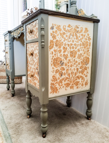 Meet Daphnaeae. It's the name of the wood nymph in Greek mythology who inhabits the laurel tree. I posted a video showing raised stencils using finnabair's gold crackling paste. I'm proud to show the final result and the overall piece. This vanity is painted with Fusion's lichen. I realized over the weekend that I haven't done a green piece and I need to change that asap. I love the grey tones in this green. As with all Fusion paints it has the perfect smooth, matte finish. I also used Fusion's pale gold on the knobs, finials, and moulds. I applied redesign with prima moulds to the center. I painted the sides and drawers with Annie Sloane's cream. The stencil I used is from prima as well and called Madelia Garden. It will be released mid August. I love how the crackled raised stencils give it an antique look and yet the paint is pristine. The vanity top has been stripped and restained dark walnut. Sealed with General Finishes high performance top coat in satin. I'm transported to the dappled woods and the moss and lichen covered rocks and dirt of an ancient forest looking at this vanity.