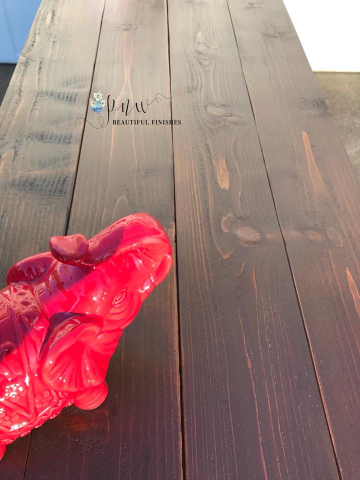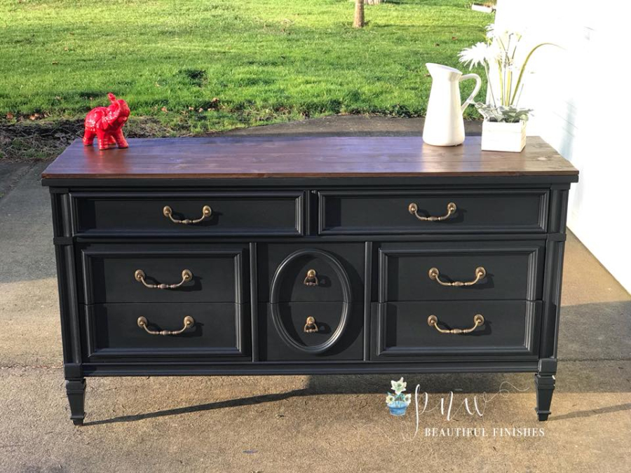 This is an 8 drawer dresser done in a beautiful black! The top in planked, stained in 'Antique walnut' by general finishes and sealed for your protection! by minwax polycrylic matte finish. The top is amazing and beautiful!