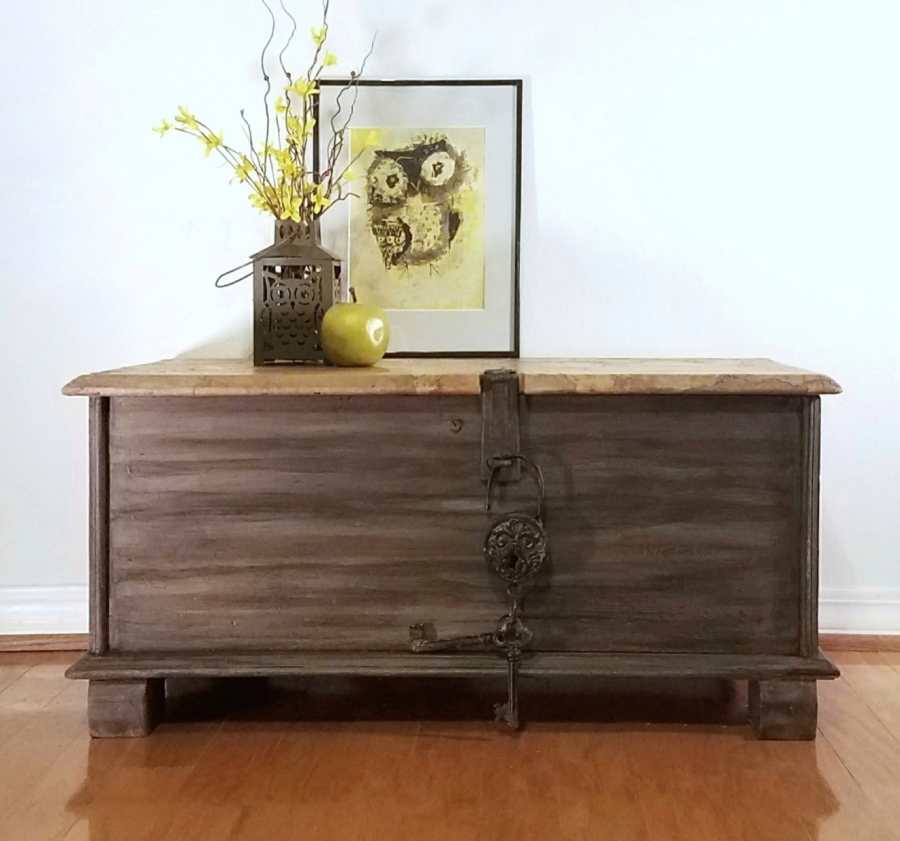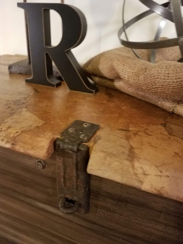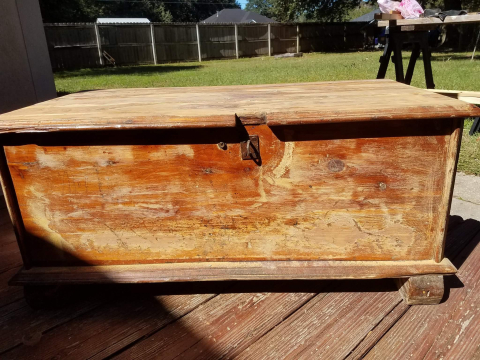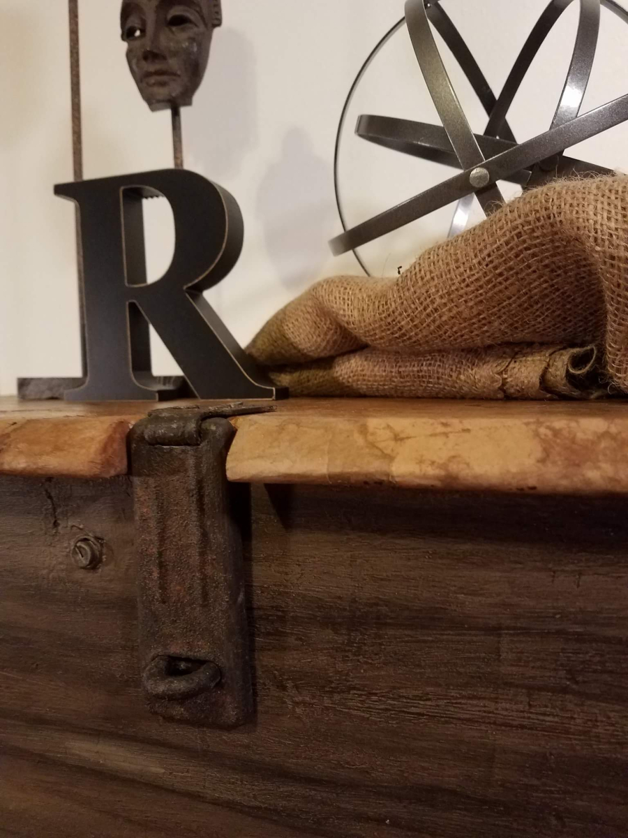 This trunk was split and falling apart. I used wood glue and bar clamped it .. Filled in holes and replaced hinge screws. I painted the base in Annie Sloan Coco and used some General Finished Dark Chocolate mixed with floetrol and made a glaze and did two heavy coats of glaze and wiped some back here and there to create multitoned dimension. This is my first decoupage project. I had some paper bags from walmart and other places and I tore these up crumbed them and dipped om a bowl of water .. I applied with modge podge until I ran out and had to water down some Gorilla Wood glue. I sealed with General Finishes high performance satin 3 coats .. the base I sealed with General Finishes Flat Out Flat