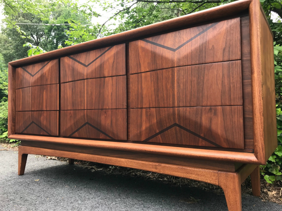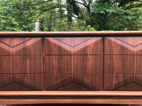 Sometimes these old pieces are covered up with such a thich stain you can see the beauty in the wood grain. Check the grain out in this 9 drawer Diamond front dresser! All it needed was a little love from our friend Java Gel. Less is more sometimes, too much can be complicated and when a piece speaks for itself you need to respect it. I sanded the entire piece down to the bare walnut wood veneer. I then wood conditioned with GF Wood Conditioner, applied GF Nutmeg gel stain on entire piece and accented with GF Java gel stain with help from my Frog tape. I then sprayed the piece with GF Clear Enduro.