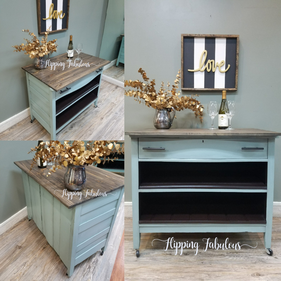 Dresser turned island with storage. A new wood top was added in General Finishes Walnut Water based stain. The base was done in Persain Blue and Dark Chocolate with High performance semigloss finish.Â