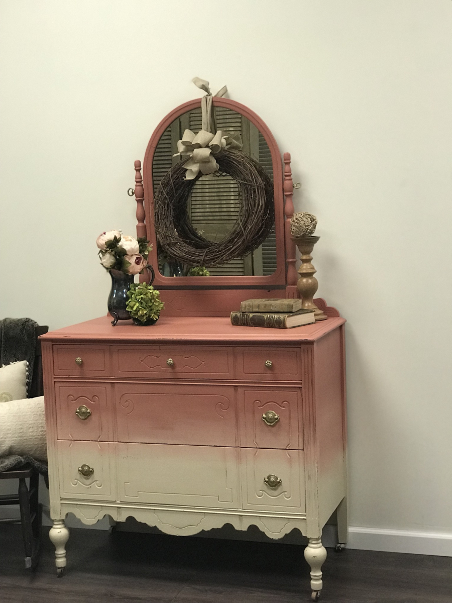 The little sweetheart was created with the imagination that she would end up in a little girl’s room with tiny ballet slipper strings hanging out of one of the drawers. I imagined that the little girl would grow to use the mirror to one day touch up her lip gloss right before she hurried out the door to school, keeping that in mind I started with a beautiful deep pink and blended down to a very soft neutral tone for a beautiful whimsical look.