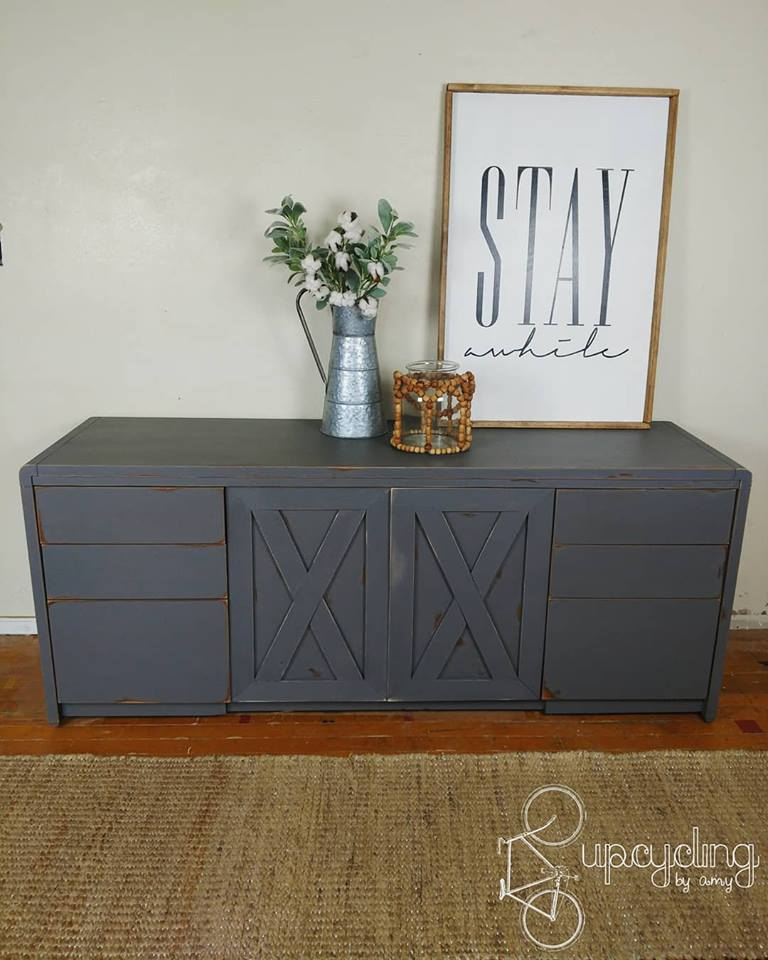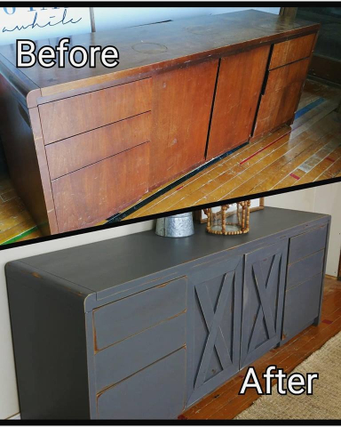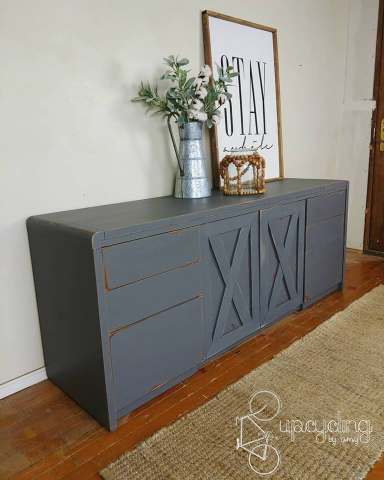What a transformation !! This client officially wins the award for the heaviest piece we have ever done! She wanted more of a farmhouse feel to it so I sanded it all down, added some trim and “X” details to the cabinet doors and painted it in General Finishes Driftwood. We did a medium distressing and it was all set! I absolutely LOVE how it turned out and it looked so cool in her living room when we dropped it back off.