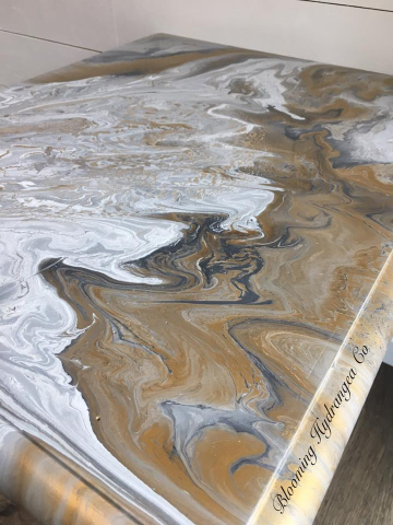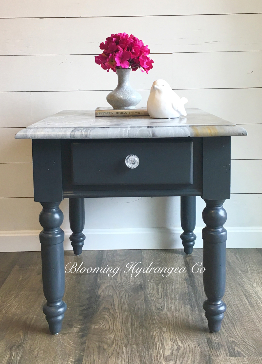 The faux marble table is a great statement piece. This side table was painted by using a "dirty pour" method then added a glass knob for simplicity.