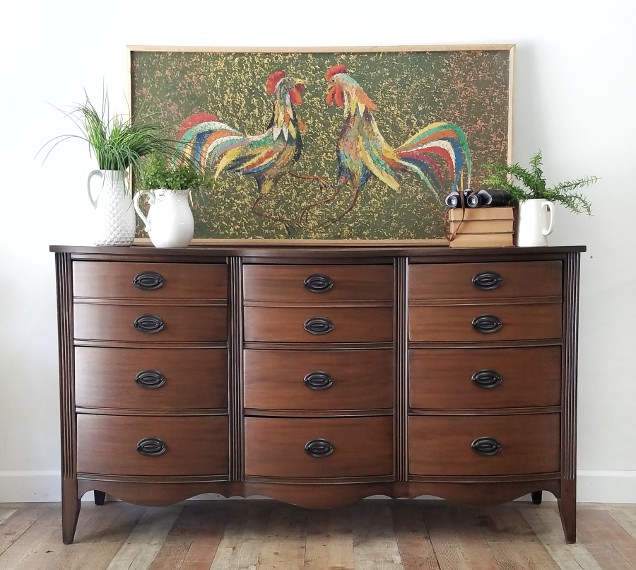 The warmth of wood will never go out of style! Not everyone can afford to pay for traditional refinishing which is exactly why we went with a faux wood finish to update this dresser. The original finish had turned orange over the decades so we updated it with a color wash in Well-Bred Brown and mimicked the look of wood grain with antique glazing. This update has fooled many!! We received countless messages requesting that we share the stain color we used! There's no stain here!