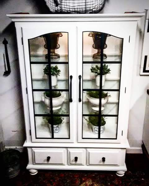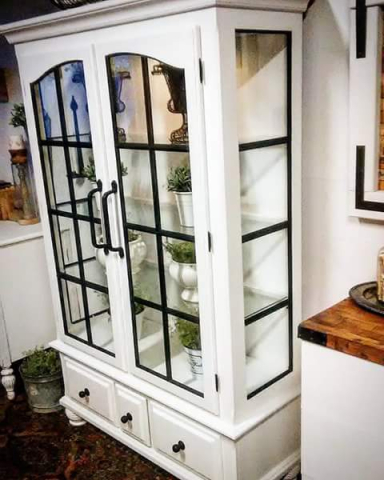 An ordinary cabinet was given an updated modern twist. The original mirrored backing was removed and replaced with beadboard. Each pane was "painstakingly" hand painted in lamp black and the shell given a finish of chalk white. The oversized iron handles were added for an unexpected twist.Â