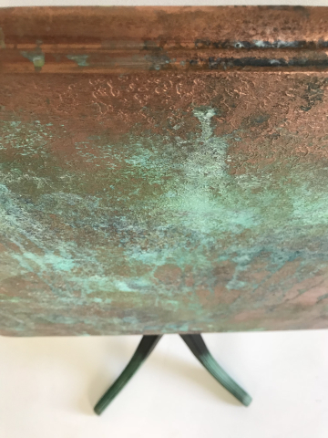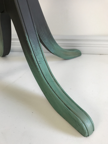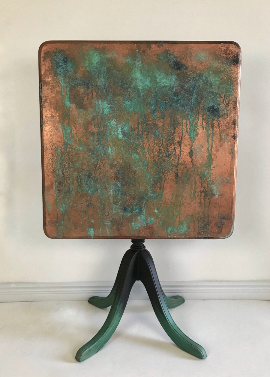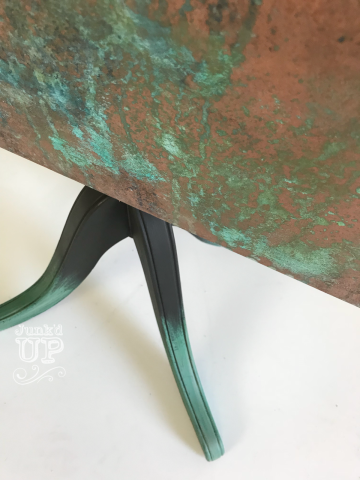 My client inherited her grandmother’s flip top table. She asked me to create something a little edgy, totally artistic and one of a kind. She had no plans to use the table but rather was looking to display it as a piece of artwork which is perfect because it’s as if it has its own built in easel. First I created texture using Texture Medium and a fauxy roller. I then applied a warm metallic finish using a combination of Modern Masters Metal Effects and Dixie Belle Patina Paints to create this amazing art piece. The table base was painted in Annie Sloan Chalk Paint in Graphite primarily with a little Florence and Duck Egg to not only accentuate the sexy leg shape but to bring some of the colors in the top down tying it all together.
