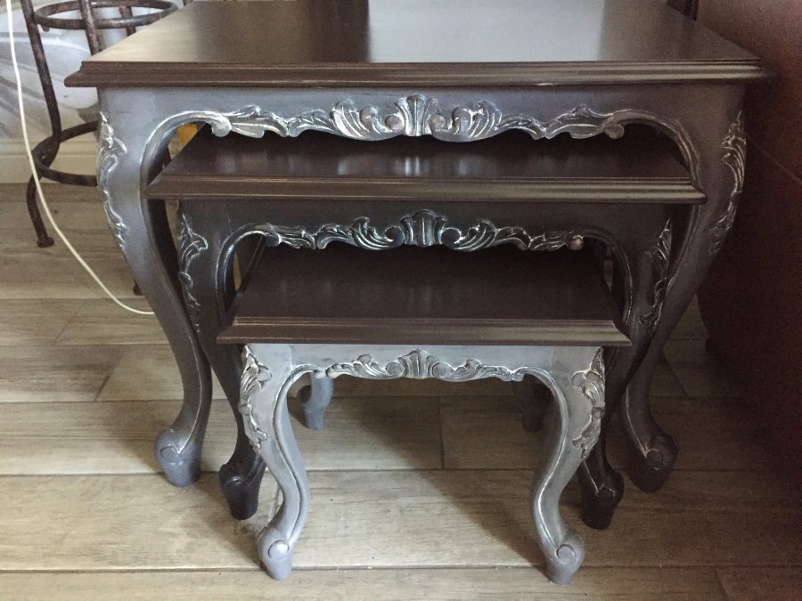 Tops painted with general finishes dark chocolate to mimic java jel, tables painted with a classy combination of lamp black, driftwood, and queenstown grey. Carving highlighted with white ning unicorn spit used as a glaze and gilding wax in pewter.