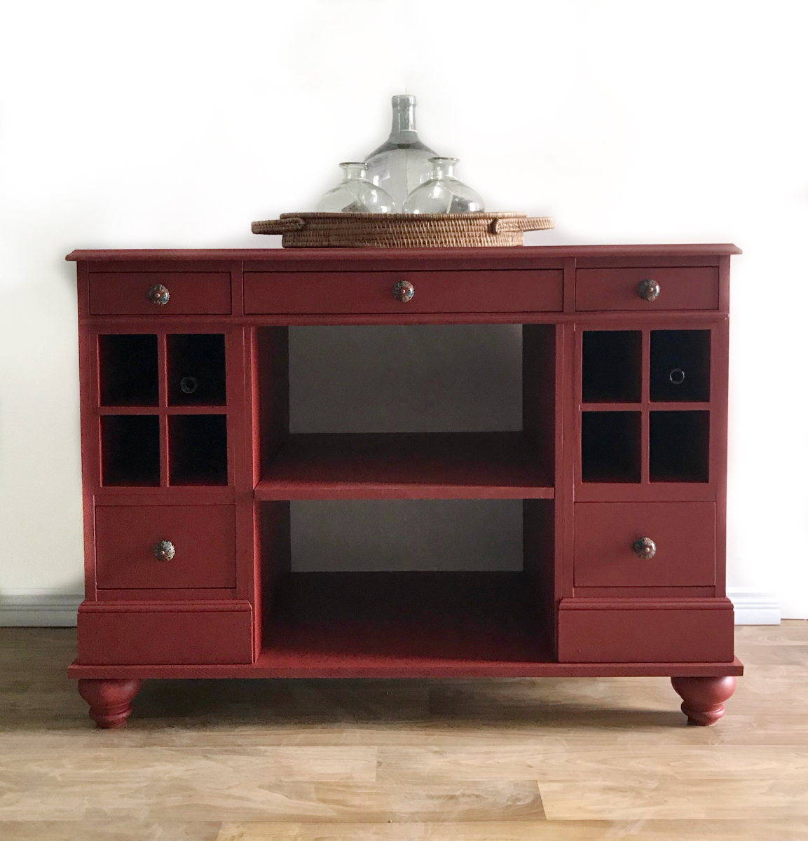 My client asked me to come up with a creative way to incorporate her grandma’s desk into her home. The problem was she didn’t need another desk. We discussed what she did need and we decided to bring Grandma’s desk into the 21st century for use as a server. We removed the two center drawers and added wine cubbies. We added a platform base and bun feet to lift the height and added an adjustable center shelf for additional storage. The entire piece was then painted with General Finishes Brick Red, sealed with High Performance Top Coat in Satin, and adorned with new knobs of my client’s choosing. You’d hardly guess that this functional piece was once a dated wood desk.