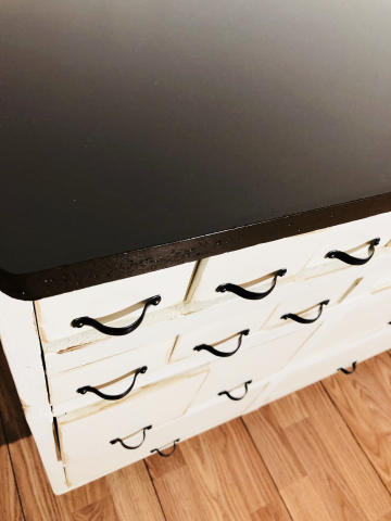 This cabinet was made by our client’s father in law. He designed it to hold nuts, bolts and assorted tools in his shop. Now it holds art supplies and is kept in the dining room. It needed a complete makeover and our client was a stained top. The top was laminate and GF Gel Stain was the solution. We used Annie Sloan Old White on the body and distressed with GF Van Dyke Glaze on the edges. We sealed the paint with Minwax Polycrylic. We applied GF Antique Walnut Gel Stain on the top. We used GF Arm R Seal to seal the gel stain. Now this piece can be passed to the next generation.