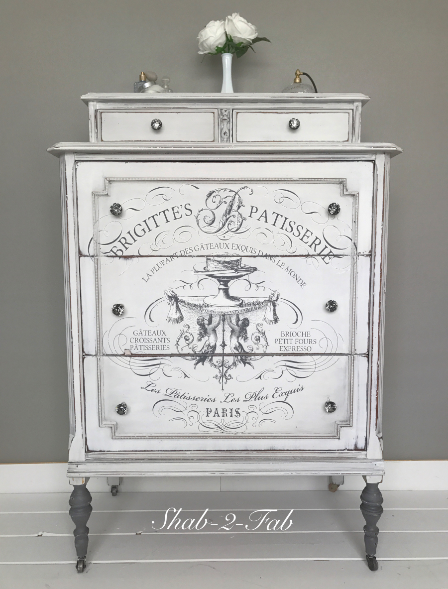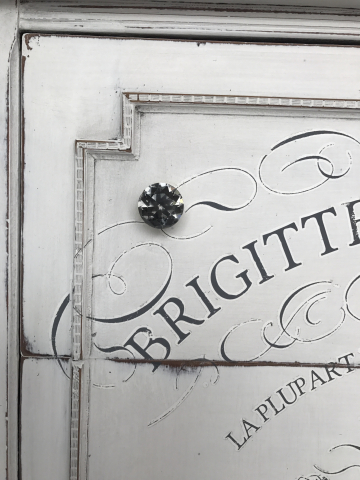 This beauty was painted in Country Chic Paint in the color Simplicity, distressed and finished with an IOD transfer and Country Chic Paint Hemp Oil And Black wax. Beautiful smokey grey glass knobs were added to tie it all together!