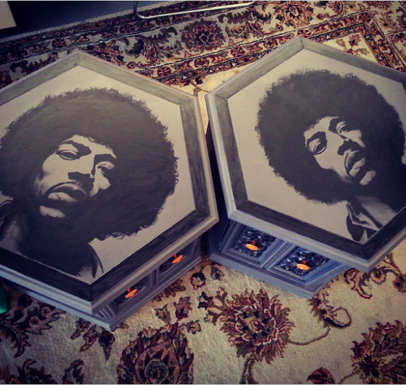 This nightstand set was first painted in the base coat which included grey, purple and black. The knobs were spray painted in orange. And then, the final but best touch - the tops were handpainted with matching Jimi Hendrix silhouettes. This pair was refinished in 2013-14, before the Farmhouse era took over. ;)