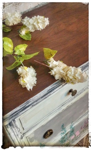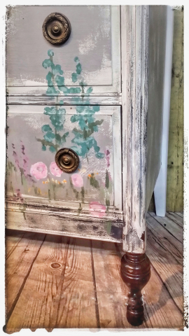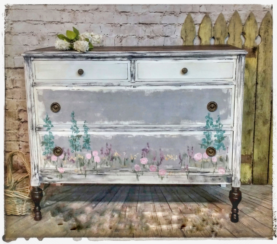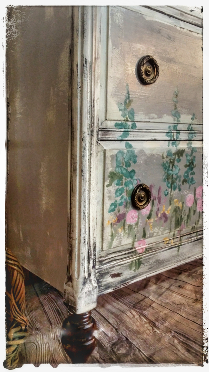 Soft, handpainted flowers in cool pastel colors combine with warm wood tones on this beautiful 1920s dresser, making Kaitlin's Garden an inviting focal point to any room.Â