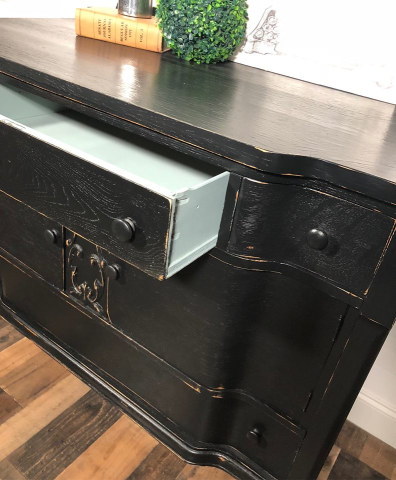 Our customer had a vision for this tiger oak buffet turned coffee bar for her new office. She wanted to accent the beautiful details and what better way than painting the exterior lamp black and distressing to the oak. On the inside she wanted a pop of color when you opened it and the combination of persian blue against lamp black is simply perfect. We just love the way this piece turned out!Â