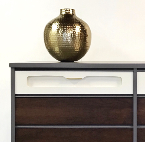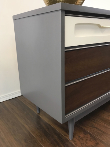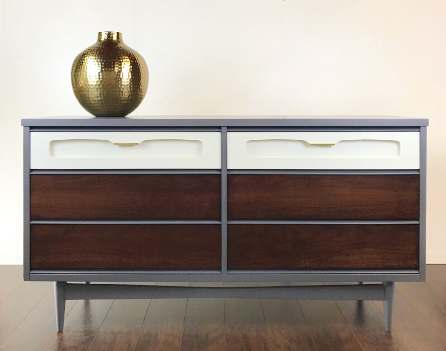 My favorite type of piece to do. Â I love these MCMÂ dressers. Â I wanted to keep a lot of the wood but also add some color. Â I chose Driftwood for the shell of the dresser, added some white to the top drawers and the other 4 drawers in gorgeous Java Gel Stain. Â The grain I found after sanding deserved to be shown off.Â