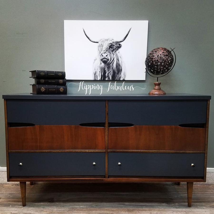 Customized in Fusion Mineral Paint Ash, these drawer fronts & legs were darkened with General Finishes Java Gel Stain & the entire piece is sealed with High Performance Satin - this beautiful Bassett dresser will last another 50 years!