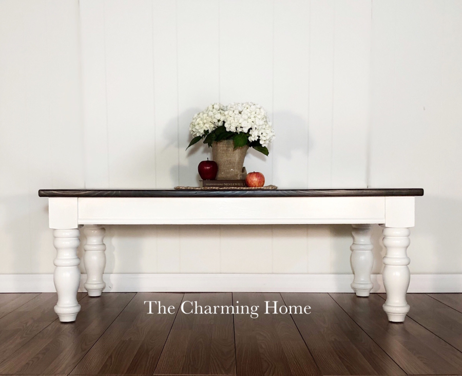 Curves for days! This head turner had been stripped to bare wood on the top and stained with General Finishes Black Stain and sealed with General Finishes Arm R Seal. The bottom was painted in General Finishes Snow White and sealed with Minwax Polycrylic.Â