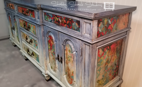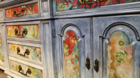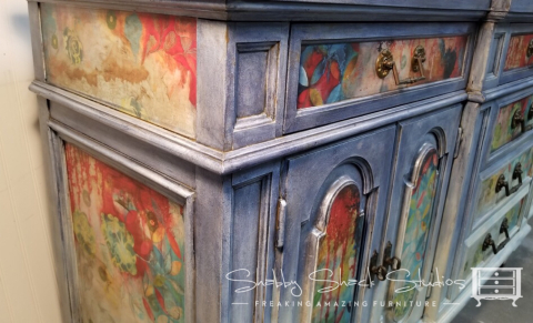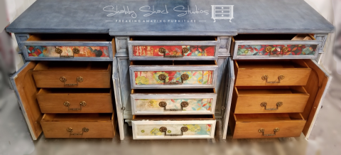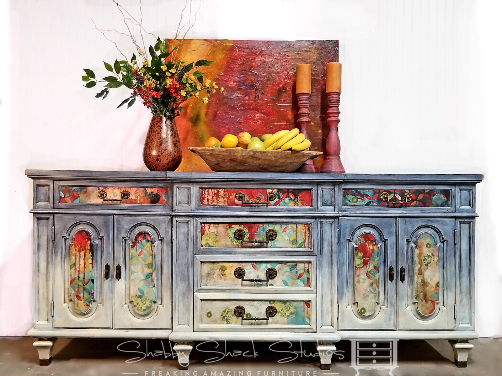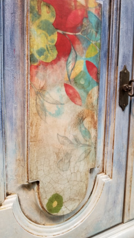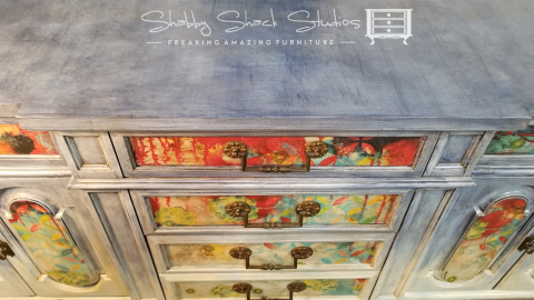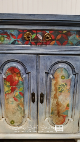 This show stopper takes your breath away with its unconventional color combinations. Remember those favorite blue jeans that you wore and LOVED? Well this mimics the beautiful range of denim colors. The decoupaged doors, drawers and sides remind me of a cute colorful bohemian shirt that flows and bouncy sleeves.....a perfect outfit. The top of this piece has been painted with a technique that actually looks like denim....the threads and all! Just by using a stiff brush with glaze and working horizontal and then vertical.