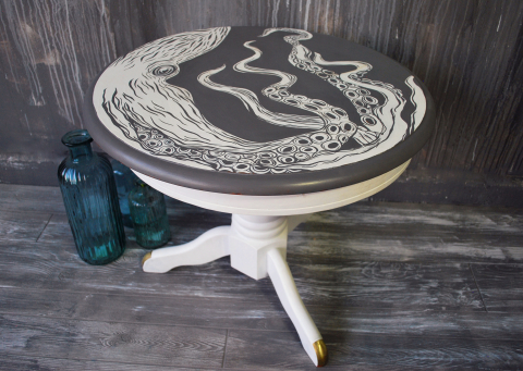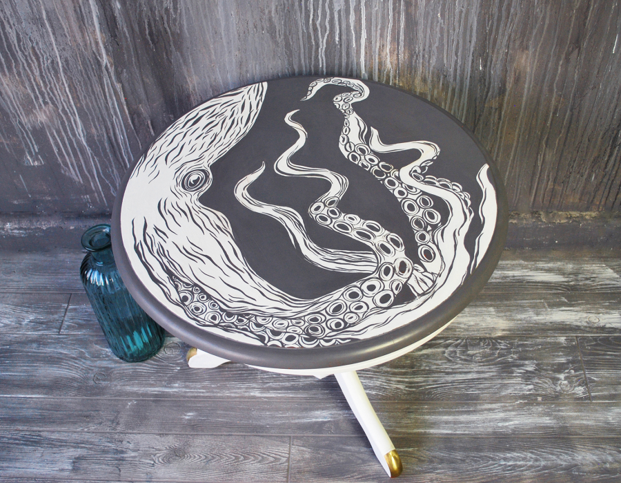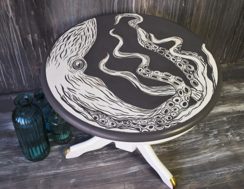 I painted this Octo Table freehand with no stencils or tracing aids. I drew inspiration for this piece from old antique book illustrations and posters. I made several sketches on paper before it was directly sketched out/painted with snow white. After the sketch was completed and I felt the lines flowed well with the table, I filled in the image with snow white. I had to make sure that the brush was constantly diped in water to get a smooth line with no bumps. Once the image was what I considered perfect I added the driftwood around the octopus painting to ensure the lines had crisp edges. After the top was finished I painted the bottom with snow white.