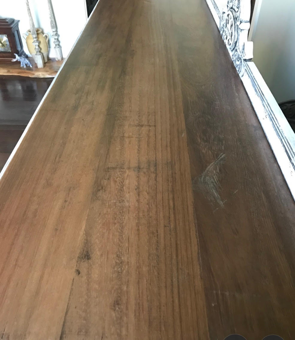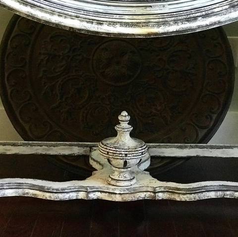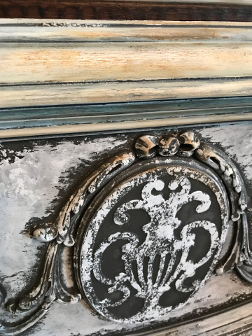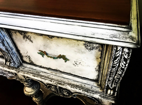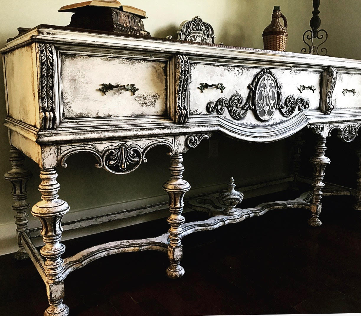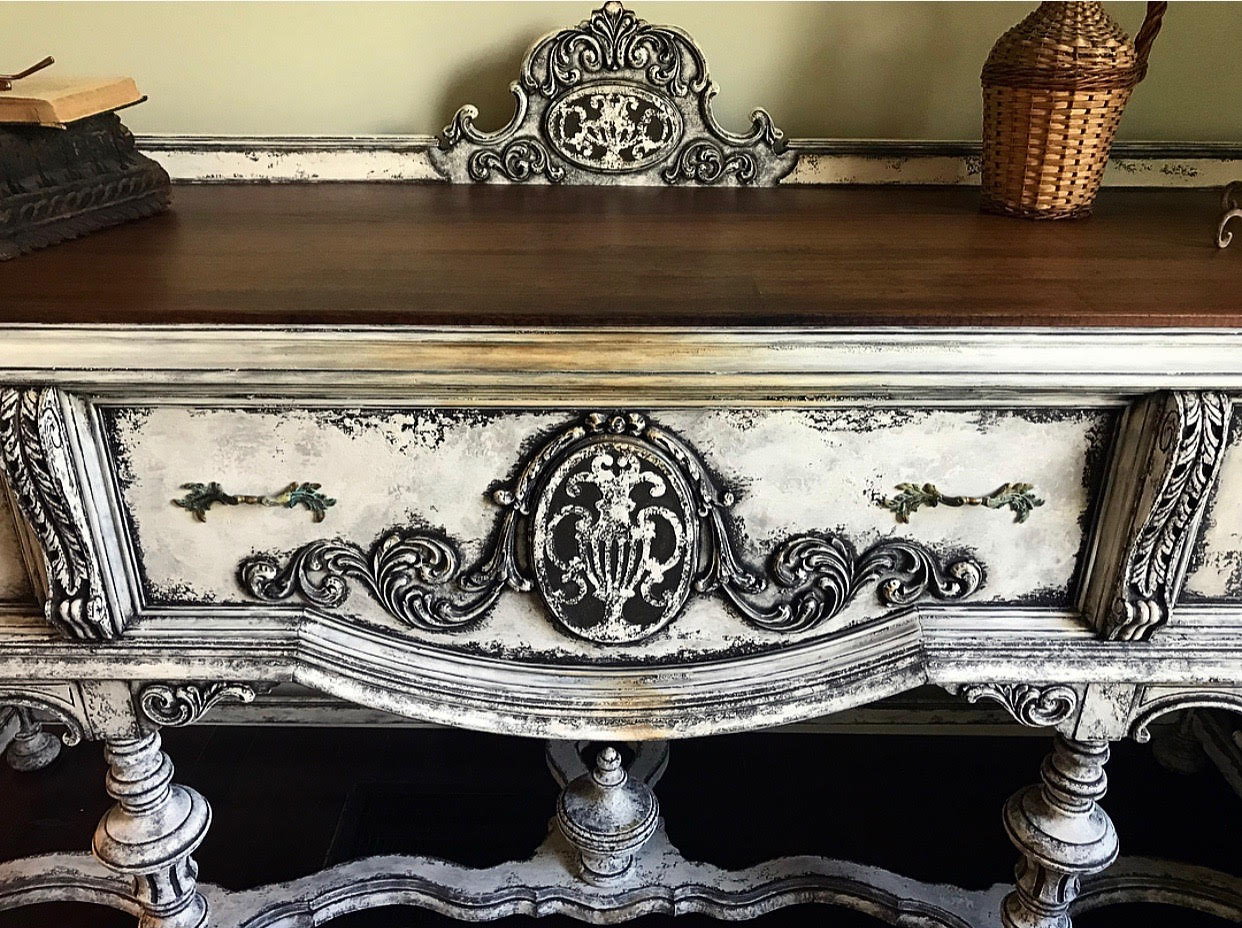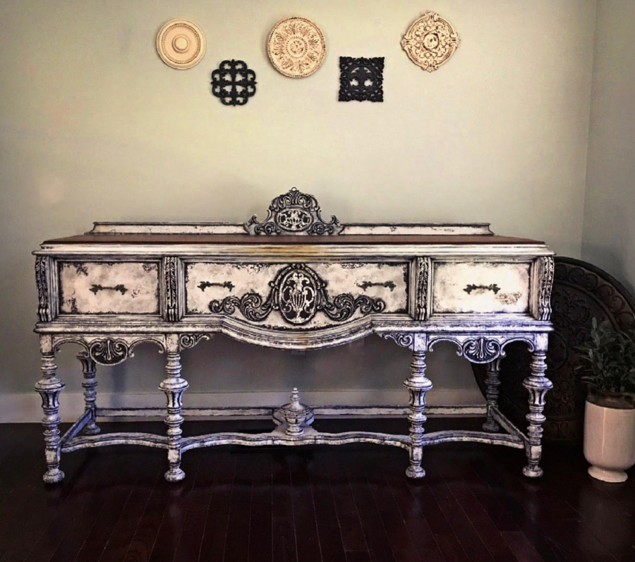This bespoke antique Jacobean Buffet is a beautiful statement piece. Its ornate lines are perfectly juxtaposed against the antiqued finish creating a versatile look that will complement many styles. I began this rare beauty's make-over by replacing the outdated original veneered top that was on it with three found exotic solid wood slabs of Iroko, which is an African hardwood tree similar to Teak. I applied three coats of General Finishes High Performance Top Coat to protect the surface. Next up, I applied a "facial scrub" (aka stucco) to enhance her already lovely patina. Then I applied a base coat of the perfect shade of black called Weathered Wood to lay the foundation for the finishing touches. The next step in the make-over process is where the transformation really took place... the paint application technique that I used was entirely done with an artist knife. I meticulously applied Pure White in layers over the Weathered Wood, blending in areas to add depth and dimension accentuating its naturally aged, worn look. This piece is not for the person who needs a smooth even paint finish but it is certainly perfectly imperfect! -- Finally, we completed her transformation with a nice rub down of clear wax which was applied to protect her new look. As with any make-over you start with good bones and allow the natural beauty to shine through revealing a unique beauty that's never been seen before.