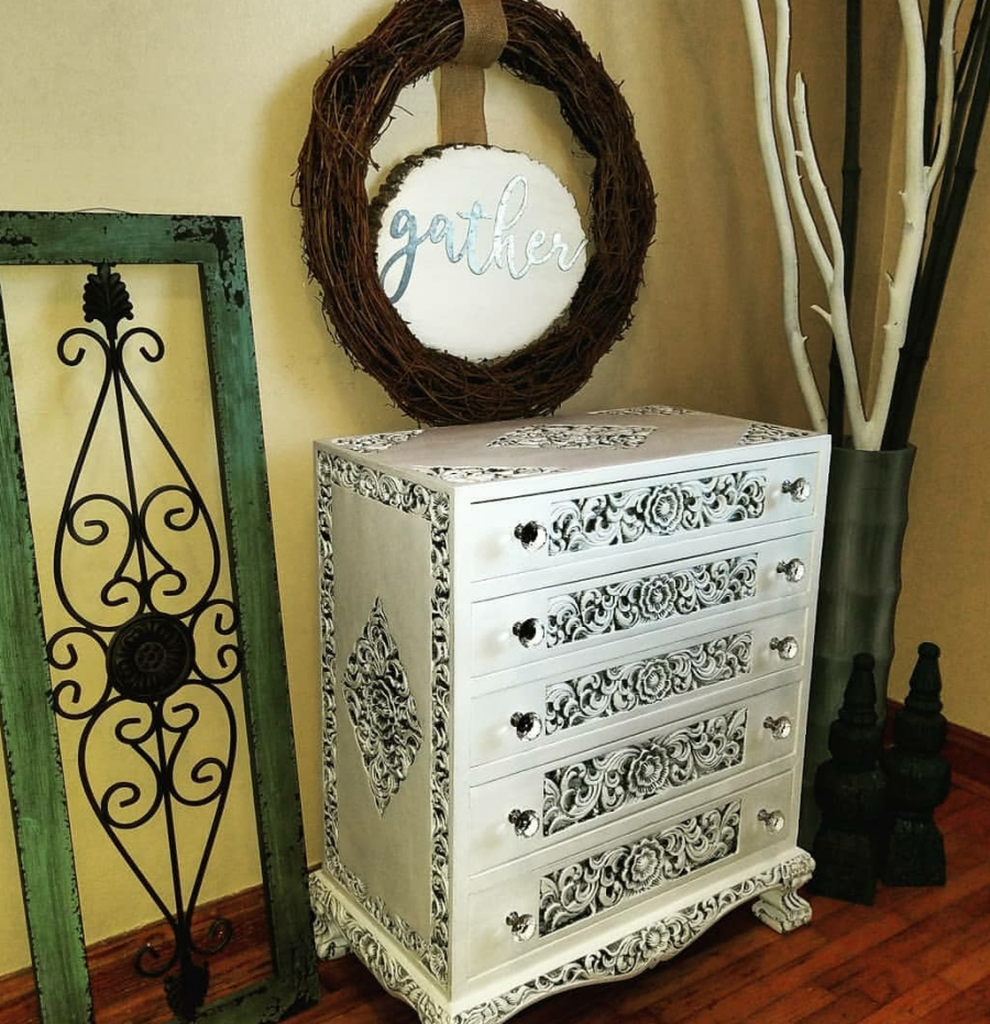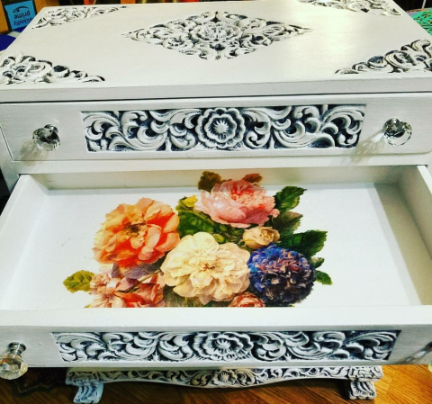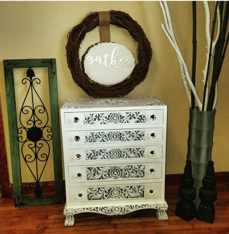 Ya'll!! When i picked up this beauty I already knew what I wanted to do with it! I wanted it White and to make all those hand-carved details pop. I started by cleaning my piece very well, this is an important step to make sure you have zero adhesion problems. I also Primed my piece since it was very old and I didn't want any bleed through since I was using White. I then started the fun part, applying the White Paint. I used about 2 coats of Dixie Belles Cotton. I then let that dry and came back and lightly sanded to get that smooth finish I love, I then applied one coat of General Finishes High Performance Top Coat to all the detailed areas and let dry. I came back and used General Finishes Pitch Black Glaze in all those beautiful detailed areas to make them Pop!! I then let that dry and came back over the whole piece with a dry brush of the Cotton. Once dried i gave it a nice coat of wax and buffed it out to get that buttery soft smooth finish. Last but not least, in each drawer I Decopauged decorative napkins by using Mod Podge. This piece has been my absolute favorite one I have done to date, and I hope ya'll enjoy it as much as I did giving it a 2nd Chance!!