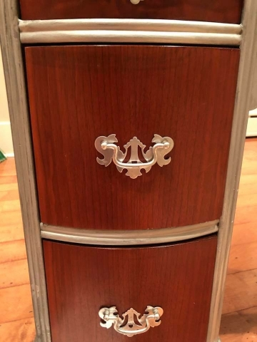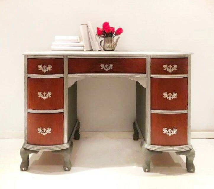 Wood that’s beautiful sometimes needs nothing but hemp oil to bring out its beautiful tones. The drawer fronts were polished and left in original stain. Frame, feet (and toes!) were glazed in silver. Result- striking!