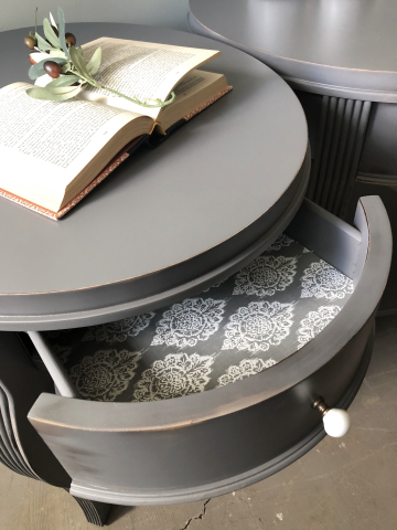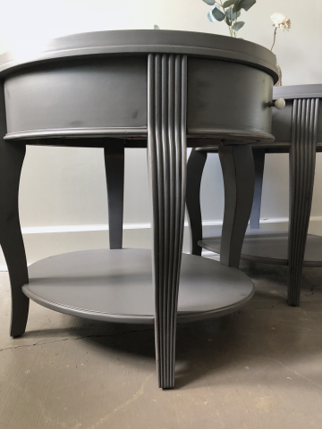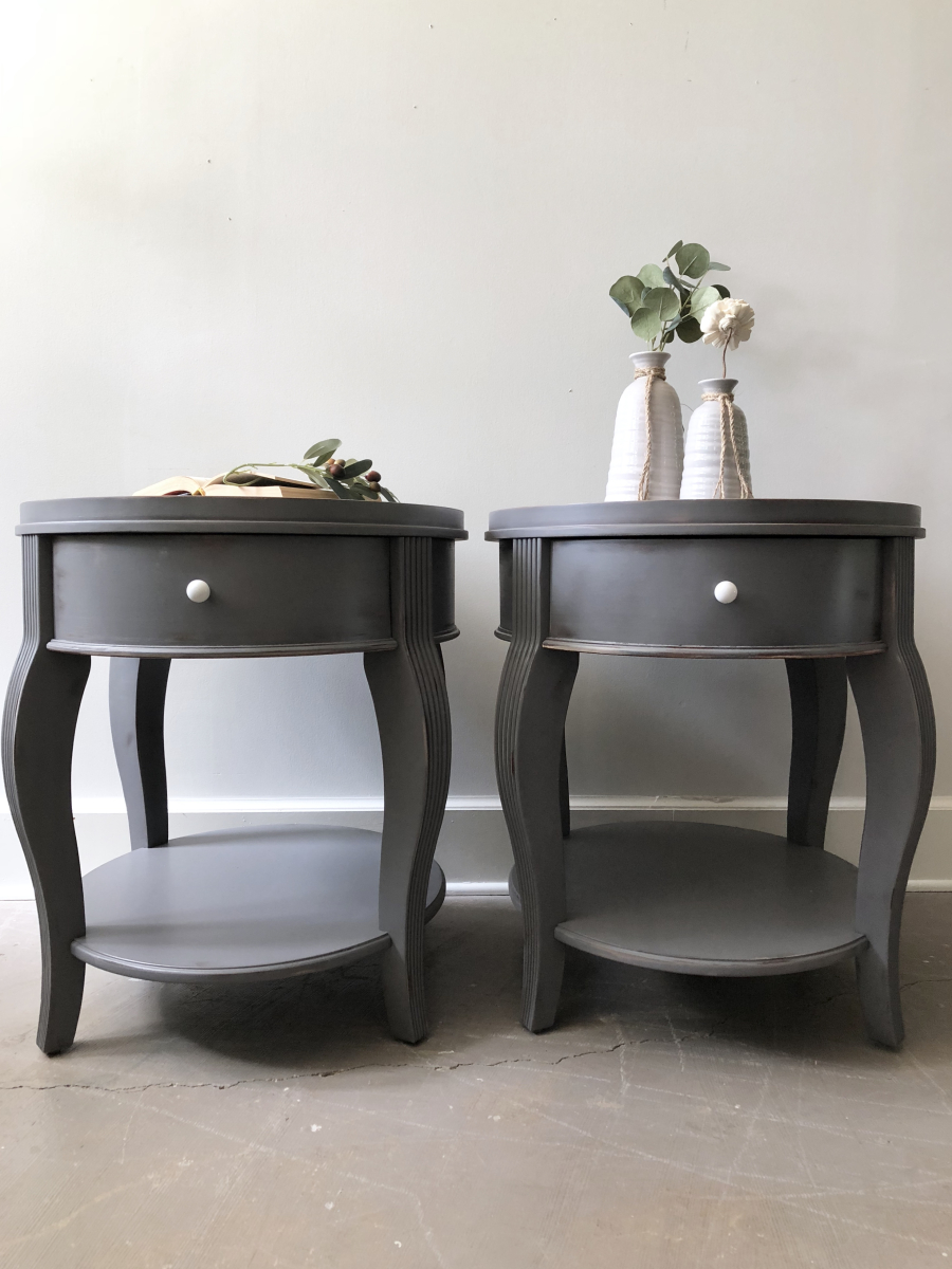 Where Modern meets French. We took a pair of so so side table that were in your standard cherry finish and turned them into stylish side tables. The great bones were already there, we just had to give them an update to fit with  today decorating styles.