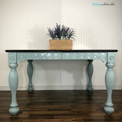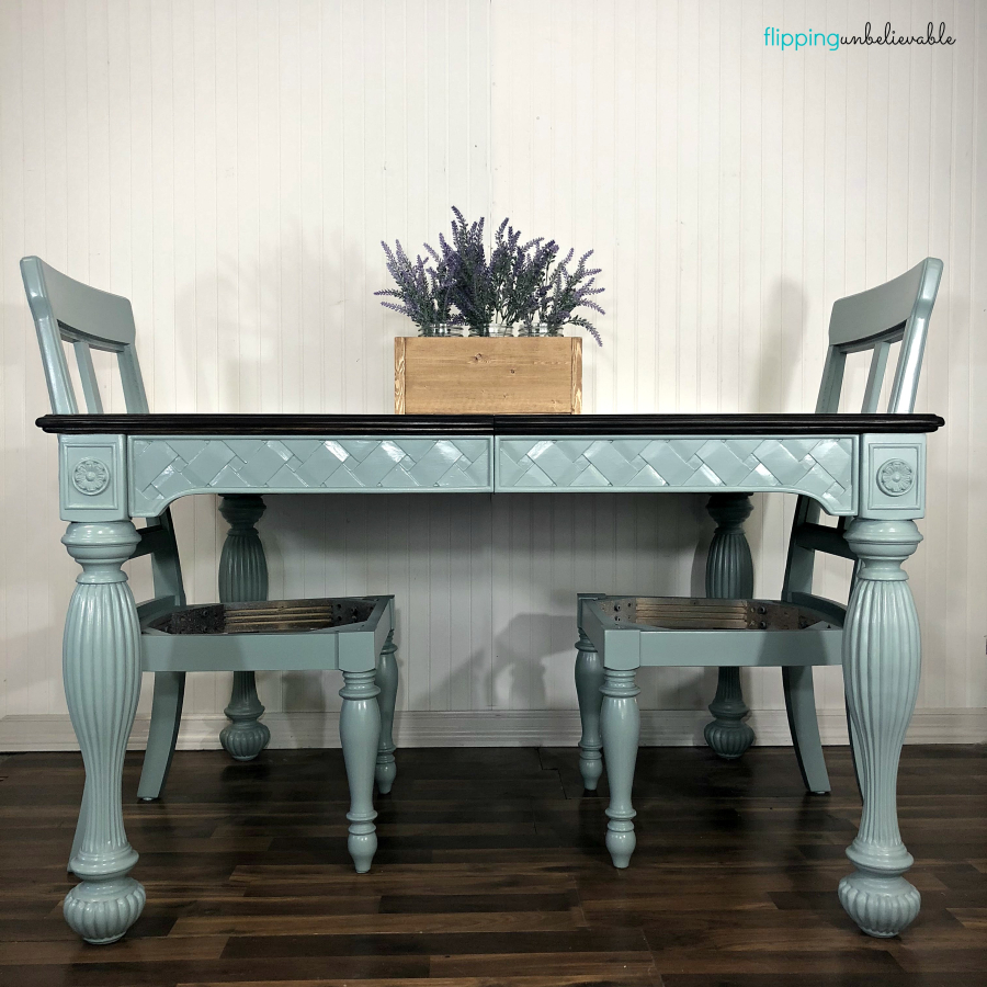 Persian blue is a beautiful subtle color that isn’t overwhelming so that it appears very neutral. The table top was stripped and stained in Espresso Water Based Wood Stain. The rest was painted in Persian Blue, and my client will be reupholstering the chair seats herself in a fun ikat pattern.