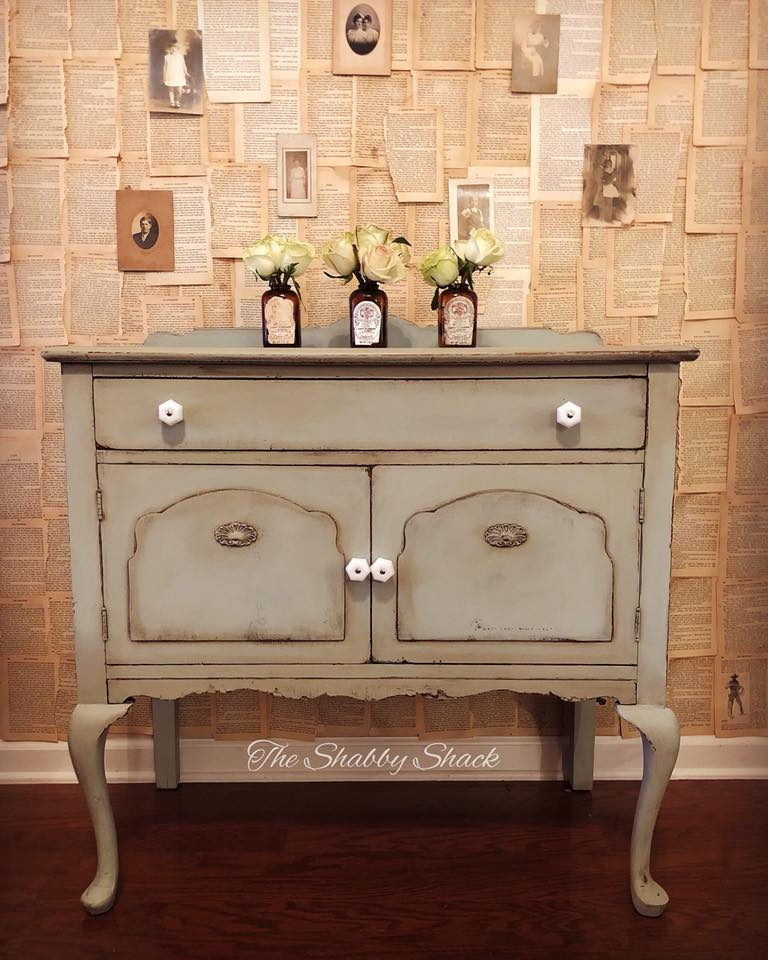Antique Petite Buffet painted in Magnolia Home Paint in the color Ameraucana Egg. It was sealed with Miss Mustard Seeds Hemp Oil and dark wax.Â