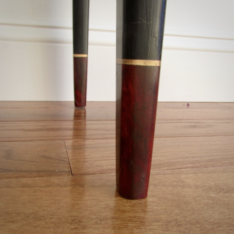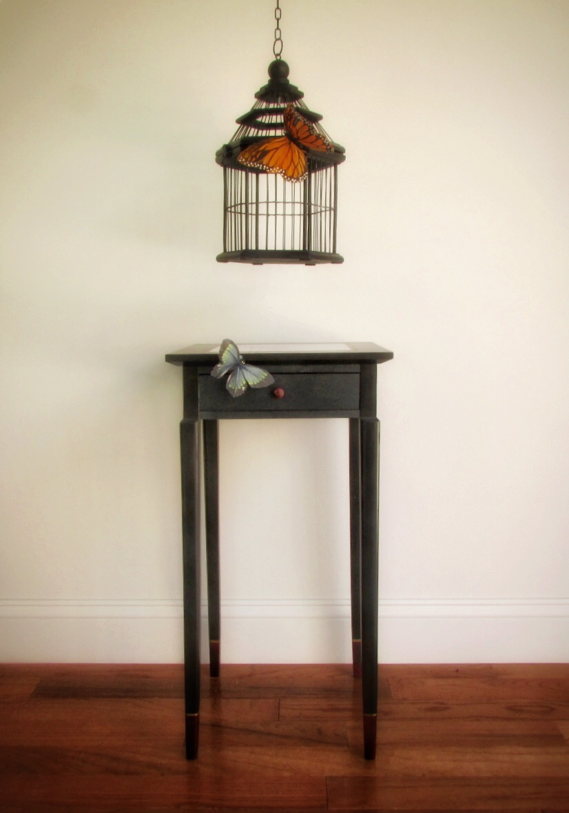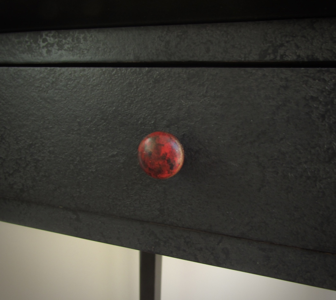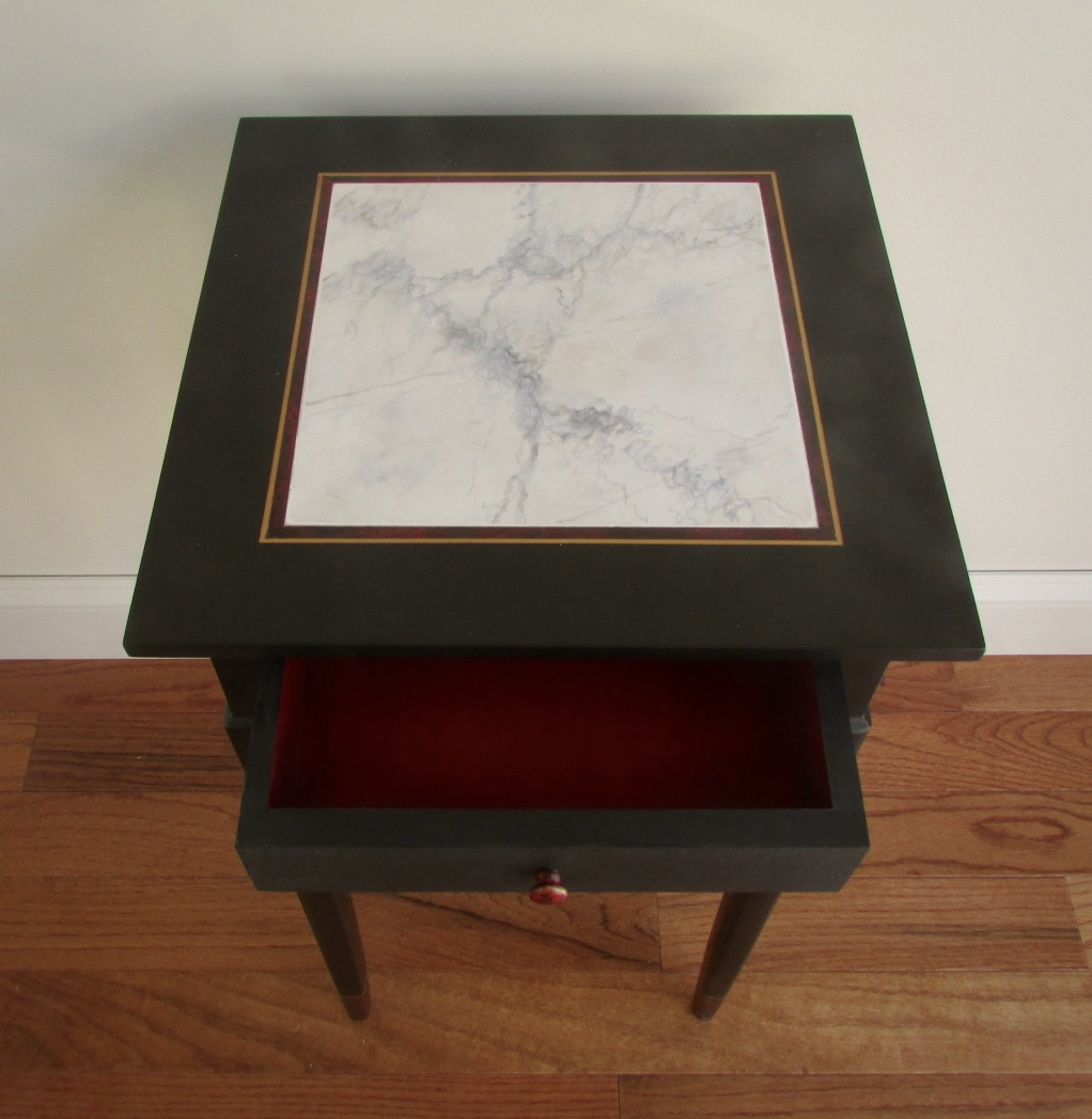 This lovely little lady will add a touch of class and elegance to any room in your home. Finished in black setcoat and glazed with mahogany stain & seal. The drawer front adds a hint of texture with Annie Sloan Chalk Paint in graphite over Faux Effects Lusterstone in black applied in a stippling fashion and sanded back. The top features a faux carrara marble inset with tortoise shell inlay on the top and legs. This table has a clear coat of varnish plus in satin.