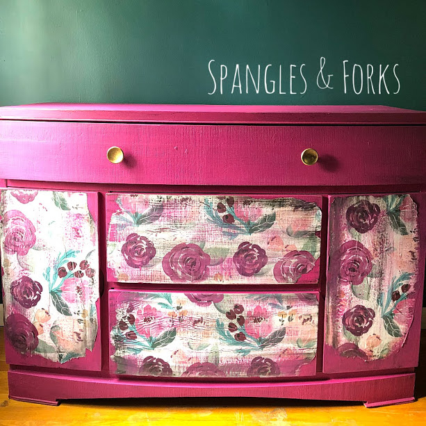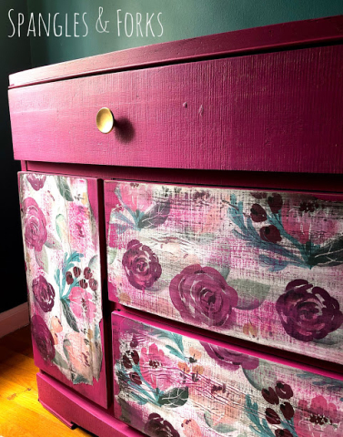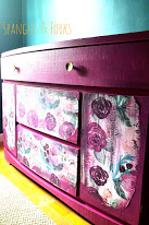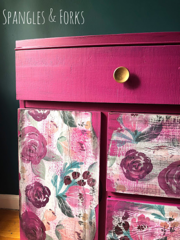 This buffet was found sitting curbside in desperate need of some love. After fixing all of her blemishes she was covered in a gorgeous fuschia color, her drawers were dressed with floral paper and she was adorned with a pair of petite gold knobs. Â
