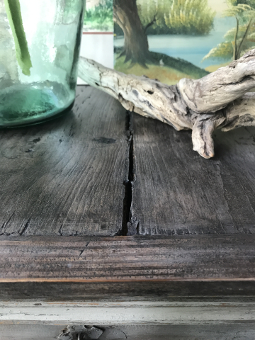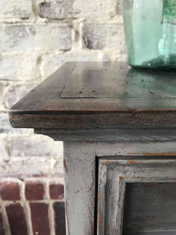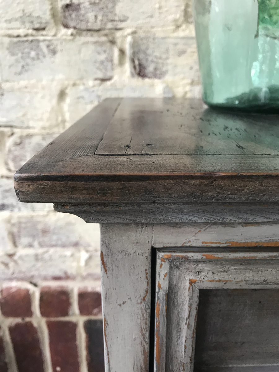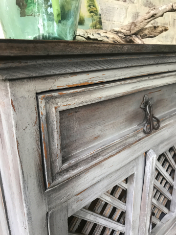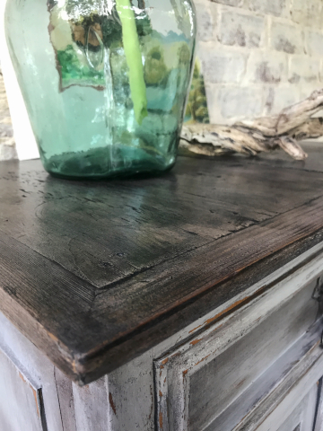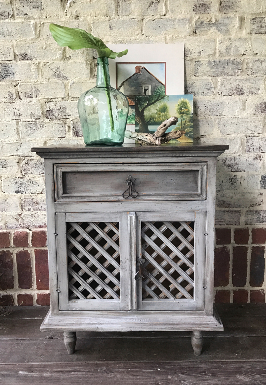 I love the simplicity and rustic style of Mexican furniture. When I stumbled on this nightstand in a thrift shop I was smitten. I especially loved the crack in the top. I knew it needed a rustic finish to complement the style. After adding some feet to bring the height up a bit, I used shades of grey from Dixie Belle paint to create highlights and shadowing. I further enhanced the effect with dark wax. The top was sanded bare and stained using a combination of watered down paint and black wax.Â